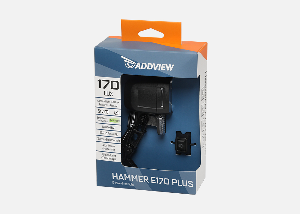 Hammer E170 ist ein E-Bike-Licht, das eine einzigartige, den StVZO-Richtlinien entsprechende optische Linse mit einer starken Leuchtkraft von 170 Lux aufweist, die ein breites Lichtfeld mit zusätzlicher Nahbereichsbeleuchtung erzeugt. Das Aluminiumgehäuse ist die Garantie für unsere erstklassige Produktqualität und ein Zeichen für ein High-End-Produkt auf dem Markt. Das seitliche Beleuchtungsdesign erhöht die Sicherheit der Benutzer in der Nacht erheblich.