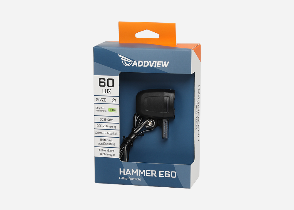 Hammer E60 ist ein E-Bike-Licht und verfügt über eine starke Lichtleistung von 60 Lux. Es ist zukunftsorientiert gestaltet mit einem quadratischen Äußeren, das robust und zuverlässig für