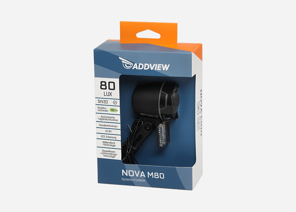 Nova M80 wird durch einen Dynamo betrieben und verfügt über ein stilvolles und kompaktes Design mit der einzigartigen "Doppellinsentechnologie", die eine beeindruckende Lichtleistung
