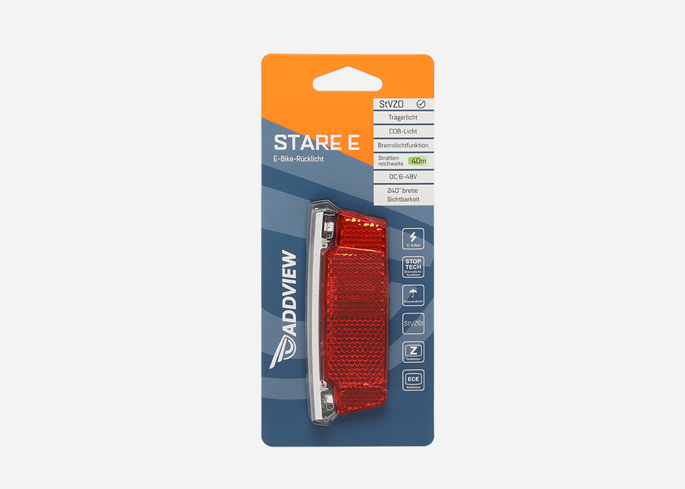 Stare E ist ein E-Bike-Trägerlicht und verfügt über eine superhelle COB-LED (21 Chips). Die besondere Bremslichtfunktion löst ein Stoppsignal während des Bremsvorgangs aus, was die Sicherheit für Radfahrer erhöht.