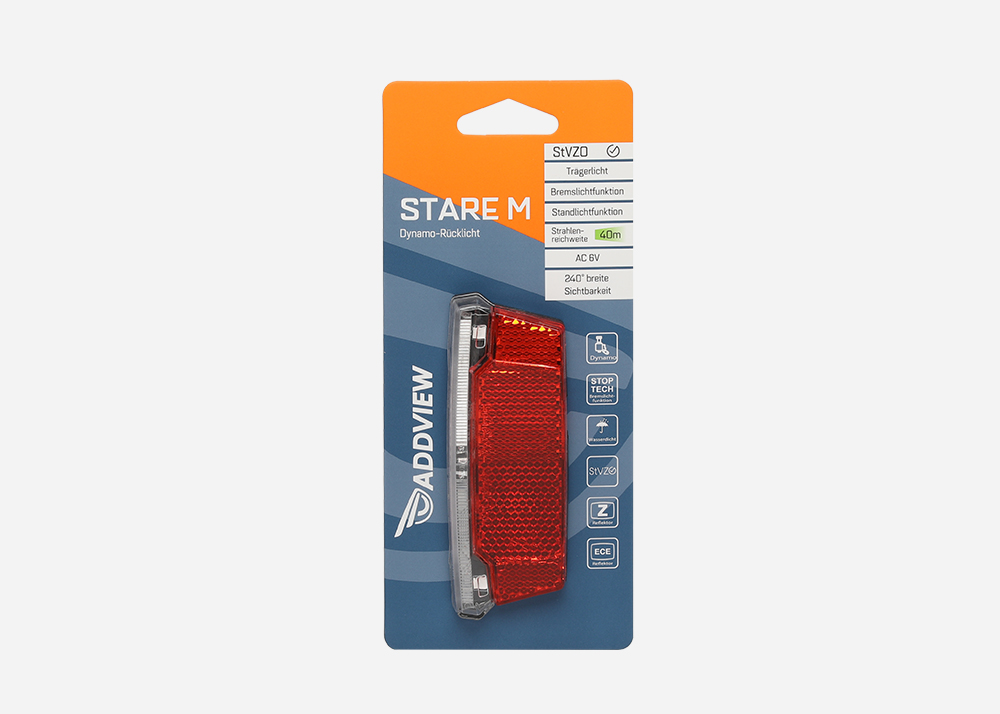 Stare M wird durch einen Dynamo betrieben und verfügt über 3 superhelle LEDs. Die spezielle Bremslichtfunktion löst ein Stoppsignal während des Bremsvorgangs aus, was die Sicherheit für Radfahrer erhöht.