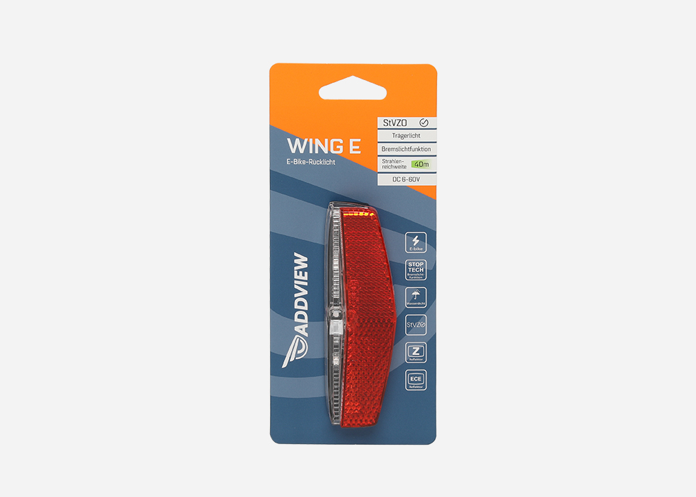 Wing E ist die E-Bike-Version und wurde entwickelt, um perfekt zu dem Trend hin zu leichteren und schlankeren Fahrrädern zu passen. Beim Bremsen des Fahrrads leuchten 2 superhelle LEDs gleichzeitig auf, um andere Verkehrsteilnehmer hinter dem Fahrrad zu warnen.