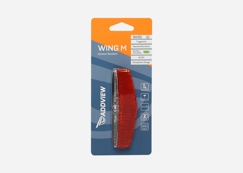Wing M ist ein dynamobetriebenes Licht, das die Lichtleitertech-nologie verwendet, um sicherzustellen, dass die Lichtverteilung auf einem optimalen Sicherheitsniveau liegt. Die Standlichtfunktion erhöht auch erheblich die Sicherheit für andere Verkehrsteilnehmer während der Nacht.